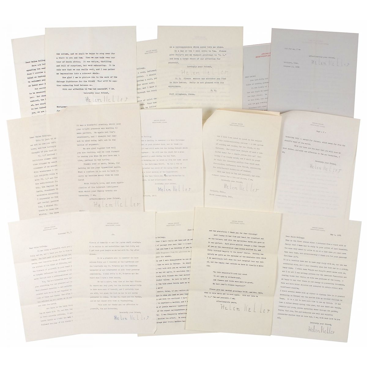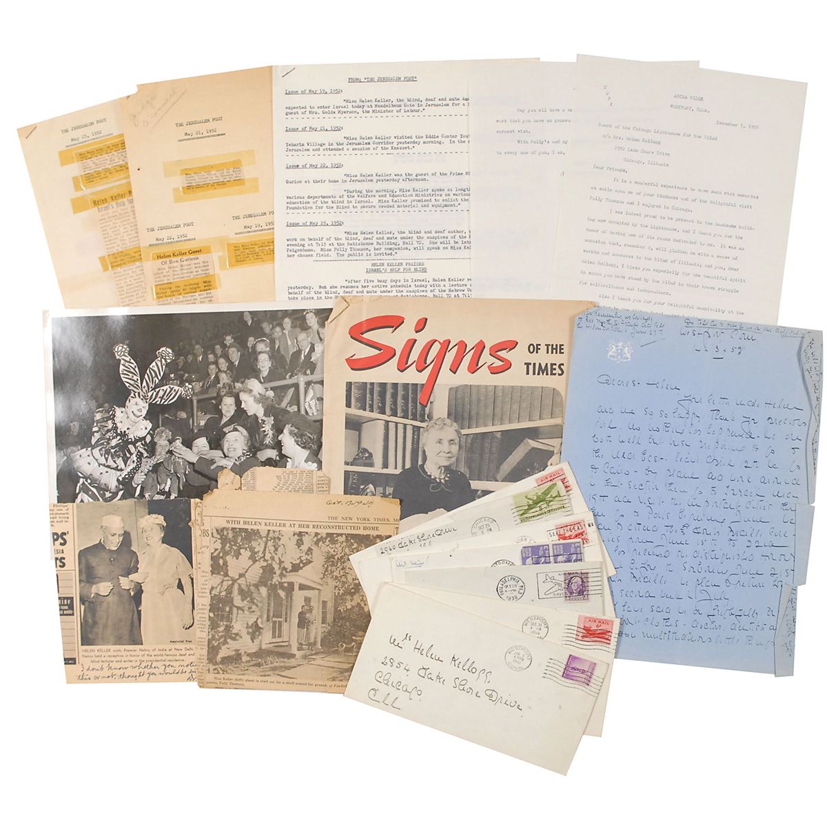 Wonderful collection of ten TLSs from Keller to Helen Kellogg of the Chicago Lighthouse for the Blind, all signed in pencil, totaling 20 pages, dated between 1946 and 1961. One two-page letter, March 17, 1952, in part: “We are now deep in preparations for a tour of the Near East, where we will visit the blind of Egypt, Lebanon, Syria, Jordan and Israel. From there we are going to Paris in June. We are taking part in the celebration of the 100th anniversary of Louis Braille’s Dies Natalis, and I have been asked to speak on the subject of his world-encircling service—a dot system of writing and reading for the blind, at the Sorbonne…I shall be proud to visit the venerable edifice from which such far-reaching influences have flowed penetrating the intellectual darknesses of mankind.” A letter of May 1, 1961, in part: “I do all I can writing letters for the American Foundation and reading books that thrill me with new problems of the blind. I am happy to say that there is new energy in preventing blindness. More and more blind children are accepted in public school with beneficent results.” A two-page letter of October 23, 1950, in part: “Our trip to California was wonderful…the dedication of the first State school for deaf-blind children in the world was an event to which I never expected to witness…There are twelve doubly handicapped children in that school now with special teachers, and the light of joy in their faces will make beautiful my last days on earth.” Many of the other letters also contain content referencing her travels, work for the blind, and charitable efforts. Also includes a 1959 ALS from Polly Thomson, Keller’s secretary. In overall fine condition. Accompanied by several newspaper clippings about Keller, a 1955 issue of Signs of the Times magazine, several original mailing envelopes, and a photo of Keller with a clown. The Chicago Lighthouse was established in 1906 and remains one of the oldest social service organizations in the city; its purpose was to help integrate the blind into society, primarily through training for job opportunities. A comprehensive archive rife with highly desirable content related to Keller’s work in helping the blind.