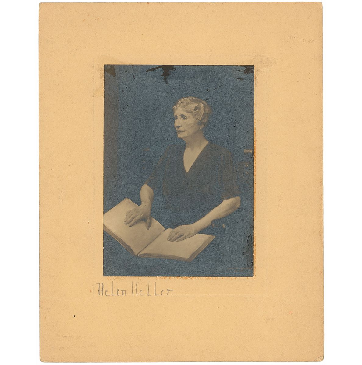 Uncommon 5.75 x 8 silver gelatin photo of Keller by Louis Dreyer, affixed to its original 11 x 14 mount, signed on the mount in pencil. In very good condition, with moderate uniform silvering to dark background, some adhesive stains along edges, and a few creases and scattered light soiling to mount.