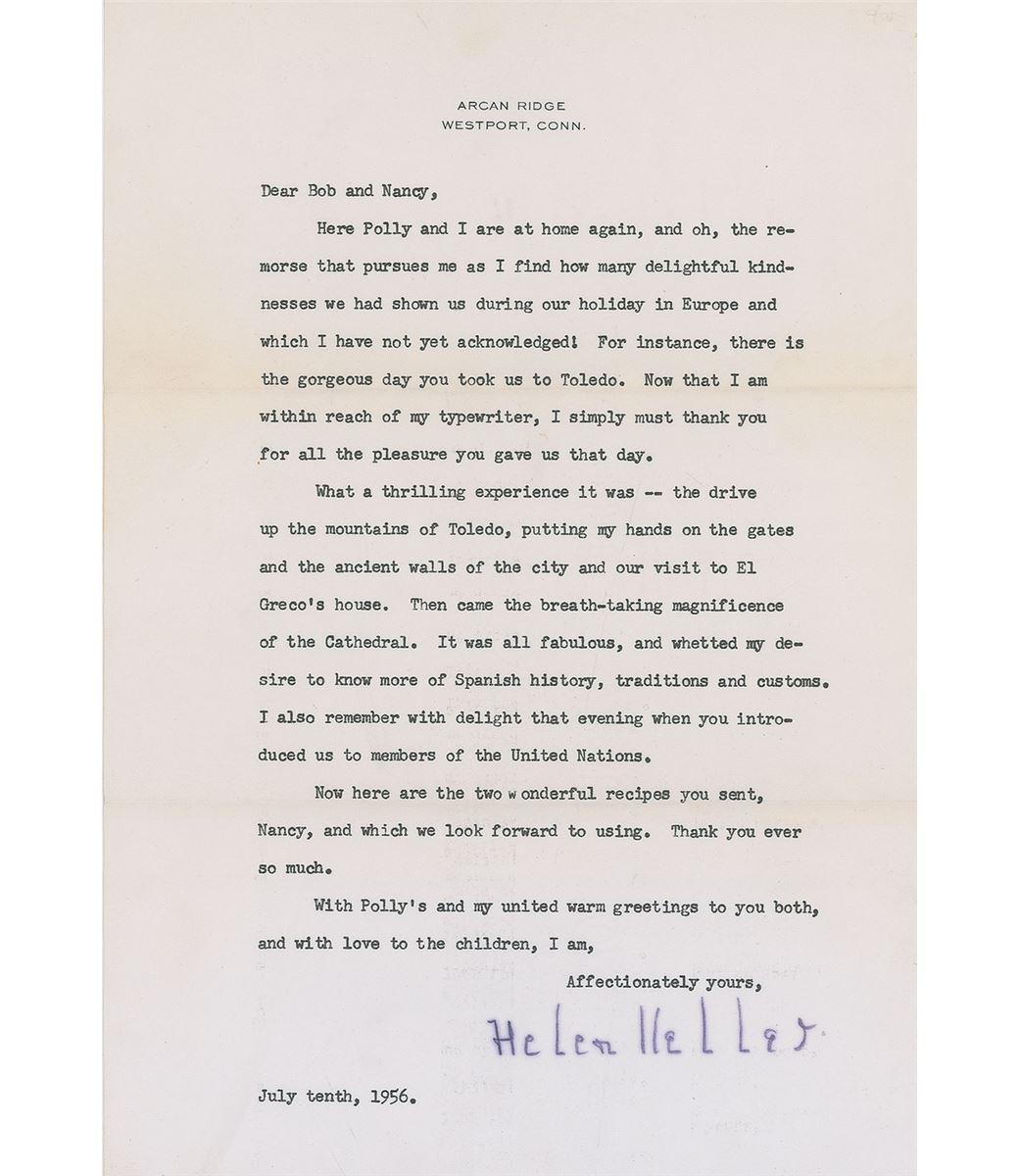 TLS signed in colored pencil, one page, 7.25 x 10.5, personal letterhead, July 10, 1956. Letter to Bob and Nancy, in part: “Here Polly and I are at home again, and oh, the remorse that pursues me as I find how many delightful kindnesses we had shown us during our holiday in Europe and which I have not yet acknowledged! For instance, there is the gorgeous day you took us to Toledo. Now that I am within reach of my typewriter, I simply must thank you for all the pleasure you gave us that day. What a thrilling experience it was—the drive up the mountains of Toledo, putting my hands on the gates and the ancient walls of the city and our visit to El Greco’s house. Then came the breath-taking magnificence of the Cathedral. It was all fabulous, and whetted my desire to know more of Spanish history, traditions and customs. I also remember with delight that evening when you introduced us to members of the United Nations.” In fine condition. Accompanied by an unsigned glossy photo of Keller.