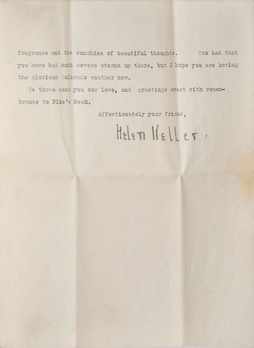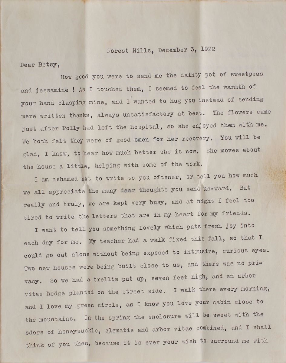 TLS, two pages on two adjoining sheets, 7.75 x 9.5, December 3, 1922. Letter to Betsy, in part: "I want to tell you something lovely which puts fresh joy into each day for me. My teacher had a walk fixed this fall, so that I could go out alone without being exposed to intrusive, curious eyes. Two new houses were being built close to us, and there was no privacy. So we had a trellis put up, seven feet high, and an arbor vitae hedge planted on the street side. I walk there every morning, and I love my green circle, as I know you love your cabin close to the mountains. In the spring the enclosure will be sweet with the odors of honeysuckle, clematis and arbor vitae combined, and I shall think of you then, because it is ever your wish to surround me with fragrance and the sunshine of beautiful thoughts." In fine condition, with some light toning and soiling.