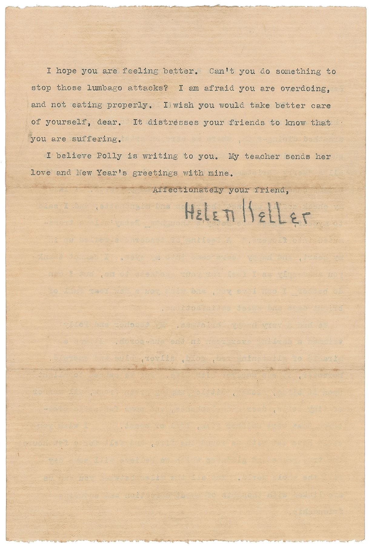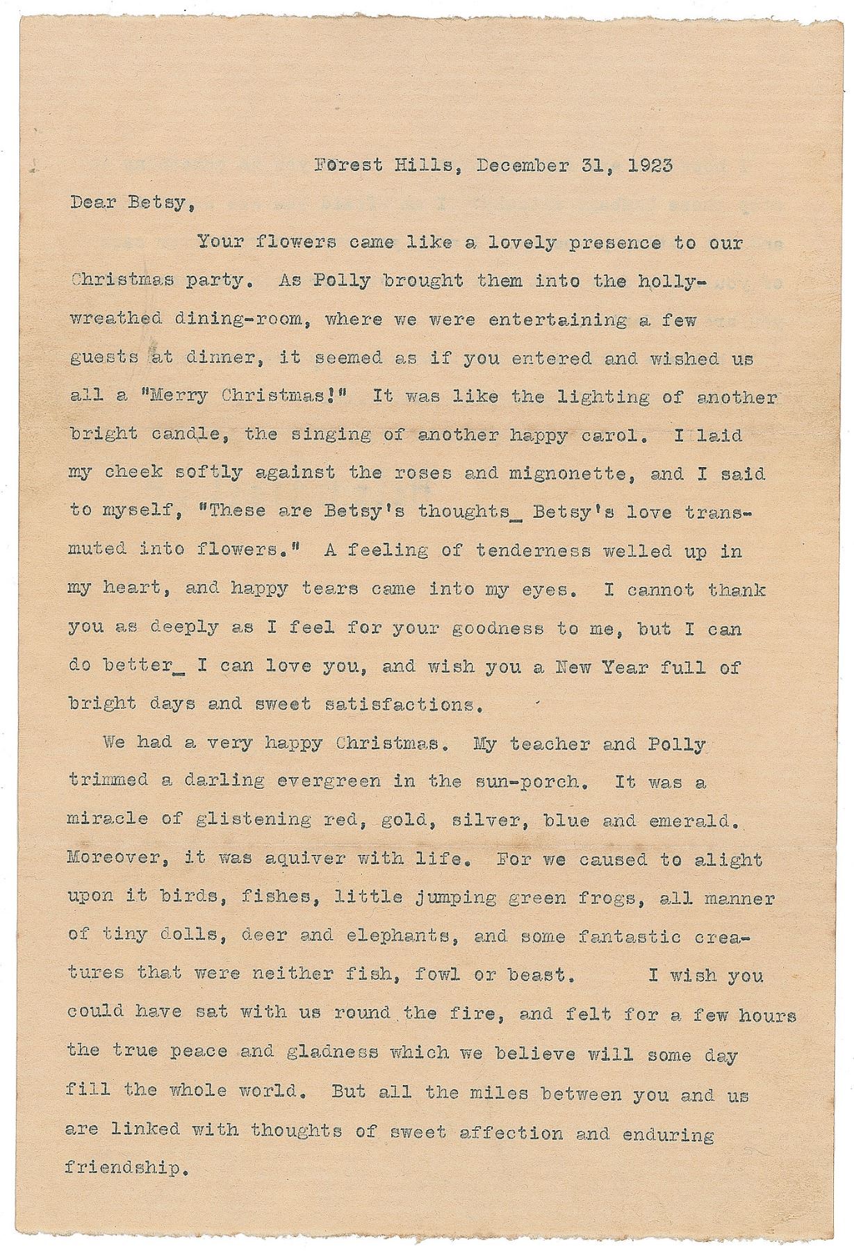 TLS, one page both sides, 7 x 10.5, December 31, 1923. Written from Forest Hills, a letter to Betsy, in part: "We had a very happy Christmas. My teacher and Polly trimmed a darling evergreen in the sun-porch. It was a miracle of glistening red, gold, silver, blue and emerald. Moreover, it was aquiver with life. For we caused to alight upon it birds, fishes, little jumping green frogs, all manner of tiny dolls, deer and elephants, and some fantastic creatures that were neither fish, fowl or beast. I wish you could have sat with us round the fire, and felt for a few hours the true peace and gladness which we believe will some day fill the whole world." In fine condition, with some light toning along folds.