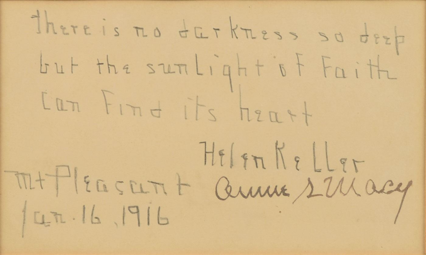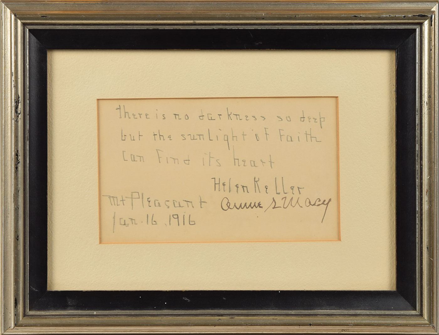 Wonderful AQS in pencil on an off-white 6.75 x 4 sheet, in full: "There is no darkness so deep but the sunlight of Faith can find its heart, Helen Keller, Mt. Pleasant, Jan. 16, 1916." Also signed in ink by her teacher, "Anne S. Macy." Matted and framed to an overall size of 12.5 x 9.5. In fine condition.