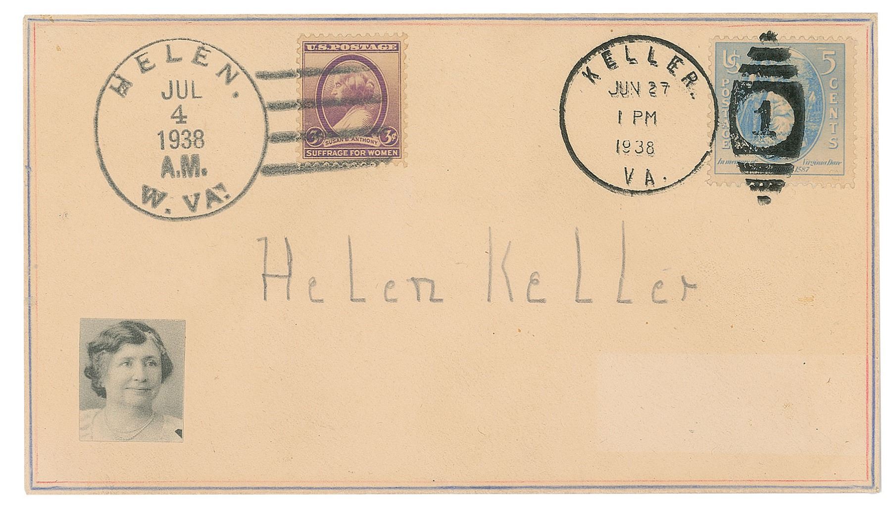 Interesting postal cover featuring postmarks at Helen, West Virginia, and Keller, Virginia, in the summer of 1938, signed in pencil, "Helen Keller." In fine condition, with a light block of toning where a mailing address was once attached.