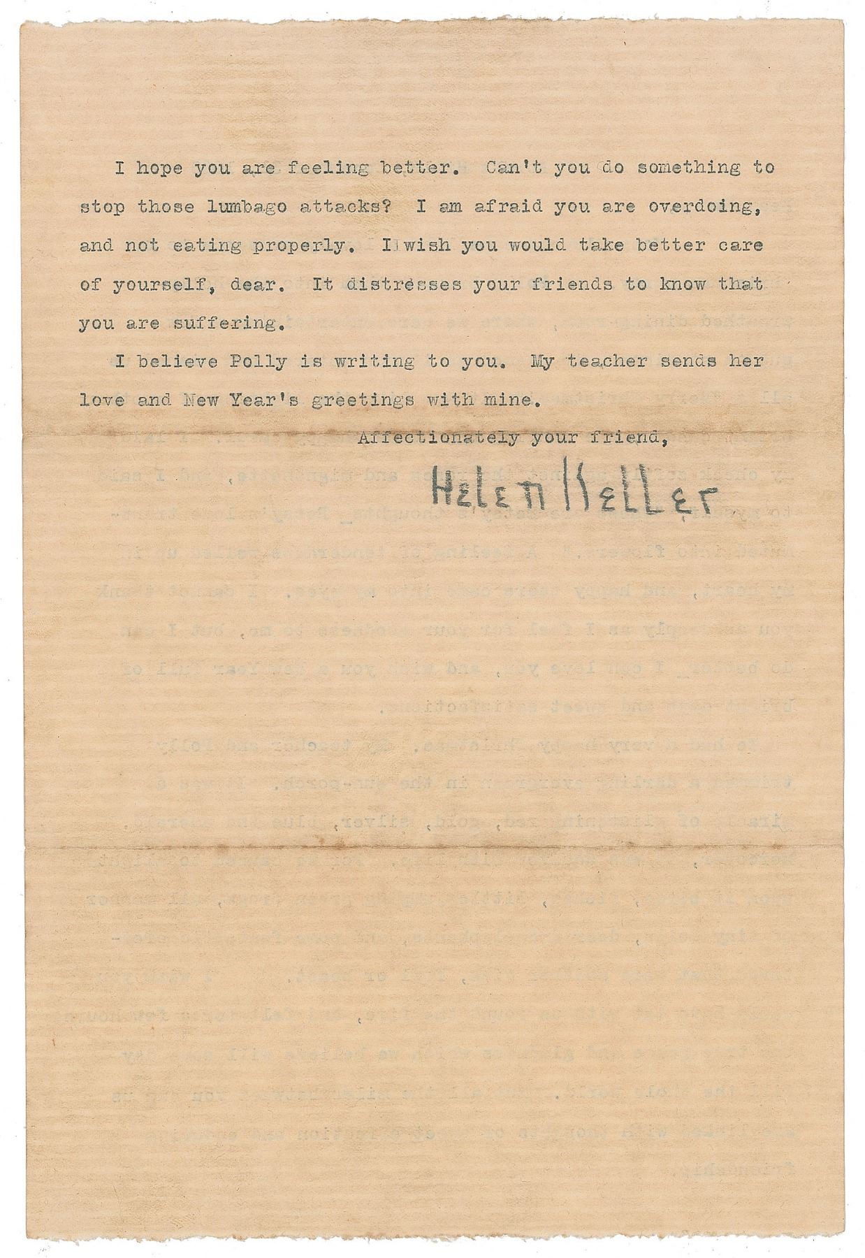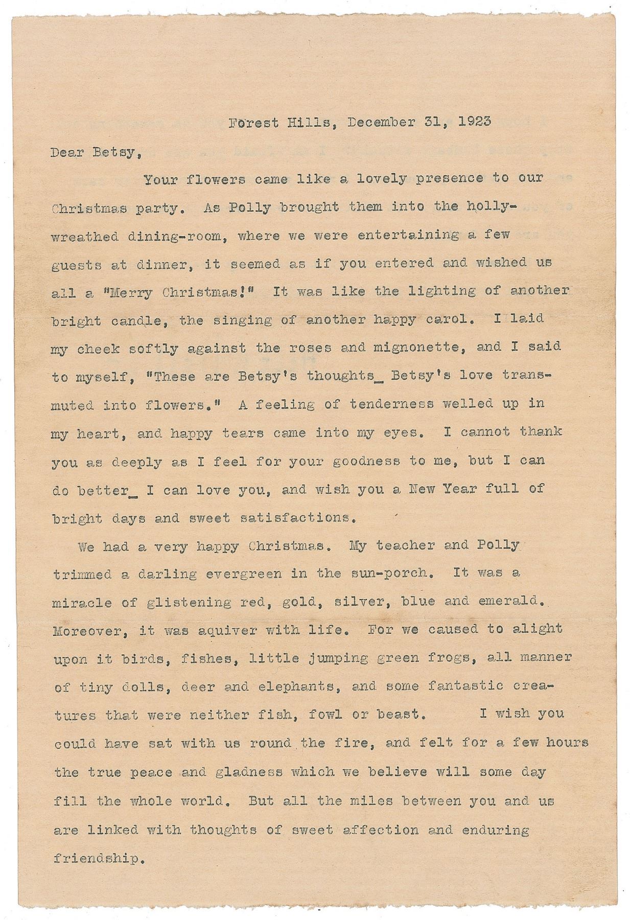 TLS, one page both sides, 7 x 10.5, December 31, 1923. Written from Forest Hills, a letter to Betsy, in part: "We had a very happy Christmas. My teacher and Polly trimmed a darling evergreen in the sun-porch. It was a miracle of glistening red, gold, silver, blue and emerald. Moreover, it was aquiver with life. For we caused to alight upon it birds, fishes, little jumping green frogs, all manner of tiny dolls, deer and elephants, and some fantastic creatures that were neither fish, fowl or beast. I wish you could have sat with us round the fire, and felt for a few hours the true peace and gladness which we believe will some day fill the whole world." In very good to fine condition, with light toning along the horizontal folds.