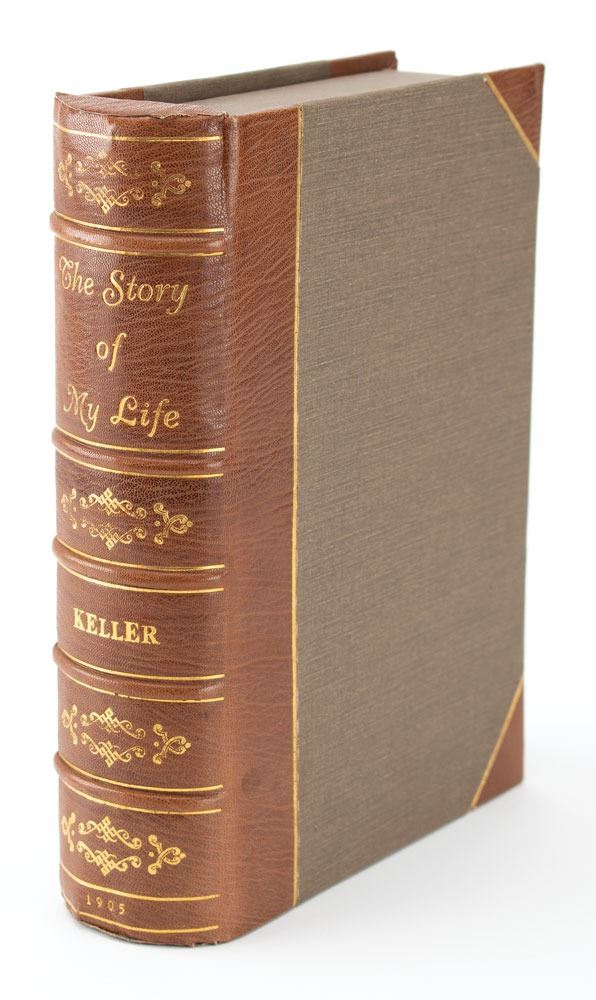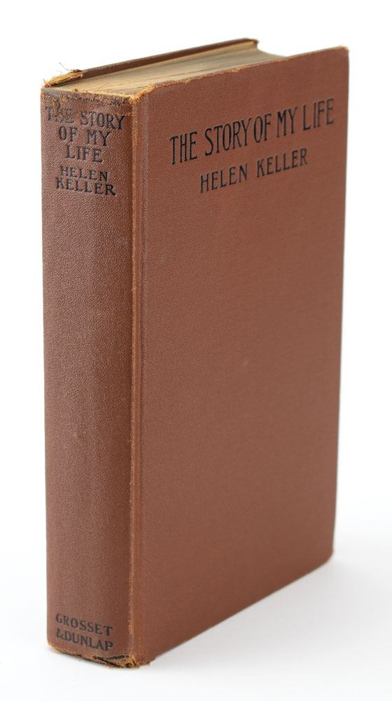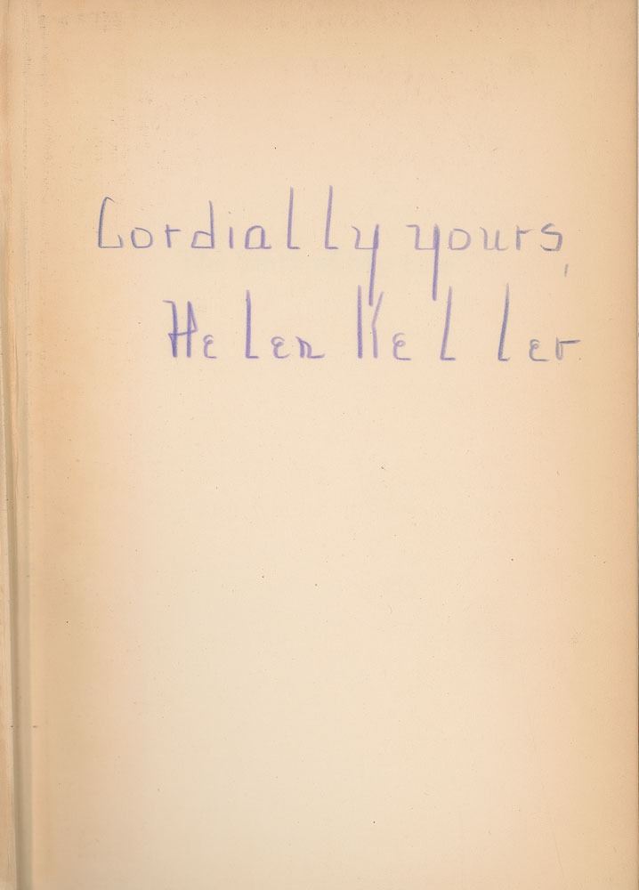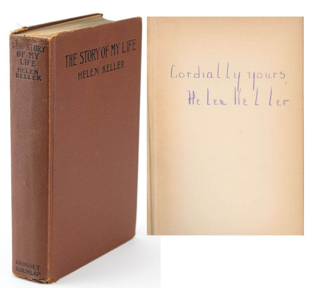 Signed book: The Story of My Life. Later printing. NY: Grosset & Dunlap, 1905. Hardcover, 5.5 x 8.25, 441 pages. Signed on the first free end page in pencil, "Cordially yours, Helen Keller." Housed in an attractive custom-made clamshell case. Autographic condition: fine. Book condition: VG/None, with fraying at spine ends.