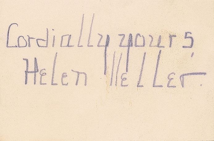 Pencil signature, "Cordially yours, Helen Keller,” on an off-white 3 x 2 card. In fine condition.