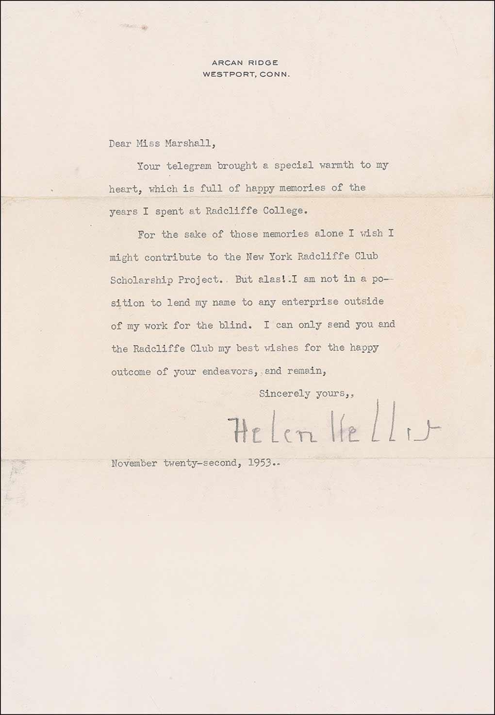 TLS, one page, 7.25 x 10.5, Arcan Ridge letterhead, November 22, 1953. Letter politely declining an endorsement. In part: “I wish I might contribute to the New York Radcliffe Club Scholarship Project. But alas! I am not in a position to lend my name to any enterprise outside of my work for the blind. I can only send you and the Radcliffe Club my best wishes for the happy outcome of your endeavors.” Helen Keller was the first deaf-blind person to ever graduate from college and in fact, she graduated cum laude from Radcliffe in 1904. Nearly fifty years later, Radcliffe was still soliciting her and in this instance, she declined to make a donation. In fine condition, with intersecting folds, and some scattered light soiling.