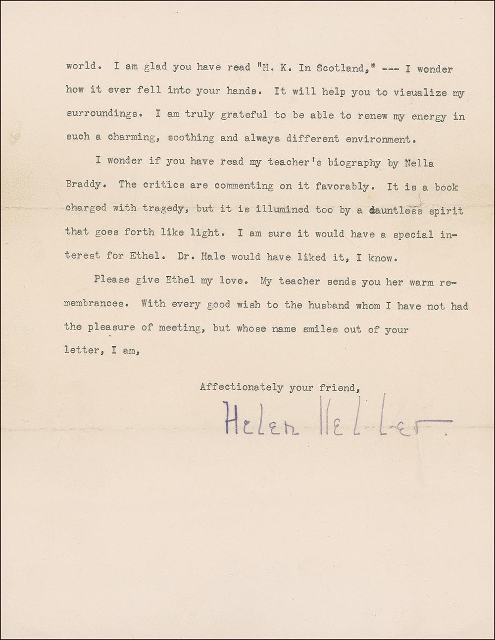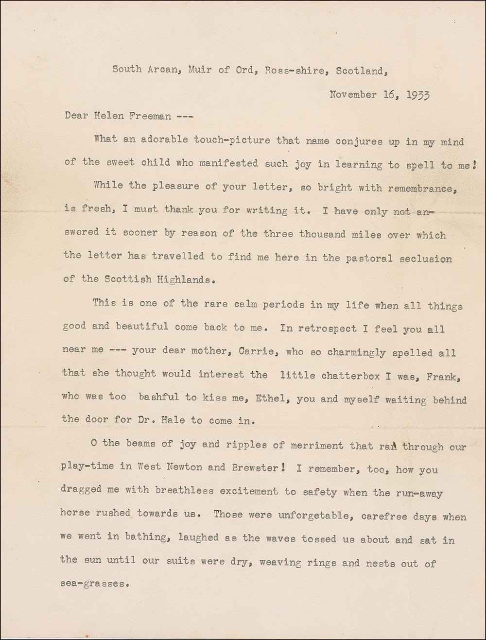 TLS, signed in her usual indelible pencil “Helen Keller,” three pages, 7 x 9, November 16, 1933. Letter written from South Arcan, Muir of Ord, Ross-shire, Scotland, and addressed to a childhood friend, Helen Freeman. In part, “What an adorable touch-picture that name conjures up in my mind of the sweet child who manifested such joy in learning to spell to me! While the pleasure of your letter, so bright with remembrance, is fresh, I must thank you for writing it. I have only not answered it sooner by reason of the three thousand miles over which the letter has traveled to find me here in the pastoral seclusion of the Scottish Highlands.