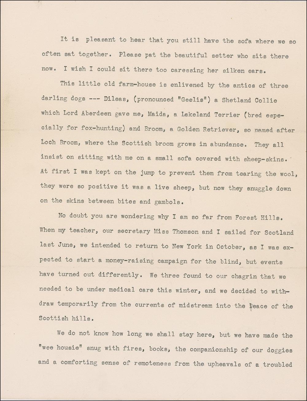 This little old farm-house is enlivened by the antics of three darling dogs…they all insist on sitting with me on a small sofa covered with sheep-skins. At first I was kept on the jump to prevent them from tearing the wool, they were so positive it was a live sheep…When my Teacher, our secretary Miss Thomson and I sailed for Scotland last June, we intended to return to New York in October, as I expected to start a money-raising campaign for the blind, but events have turned out differently. We three found to our chagrin that we needed to be under medical care this winter, and we decided to withdraw temporarily from the currents of midstream into the peace of the Scottish hills. We do not know how long we shall stay here, but we have made the ‘wee housie’ snug with fires, books, the companionship of our doggies and a comfortable sense of remoteness from the upheavals of a troubled world…
