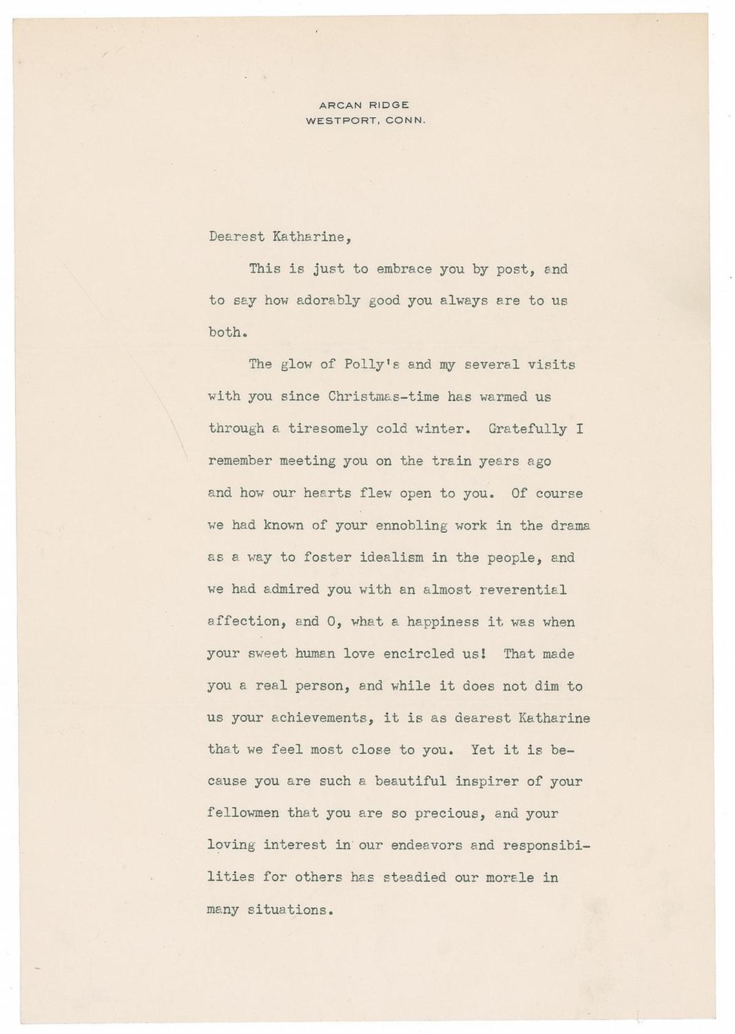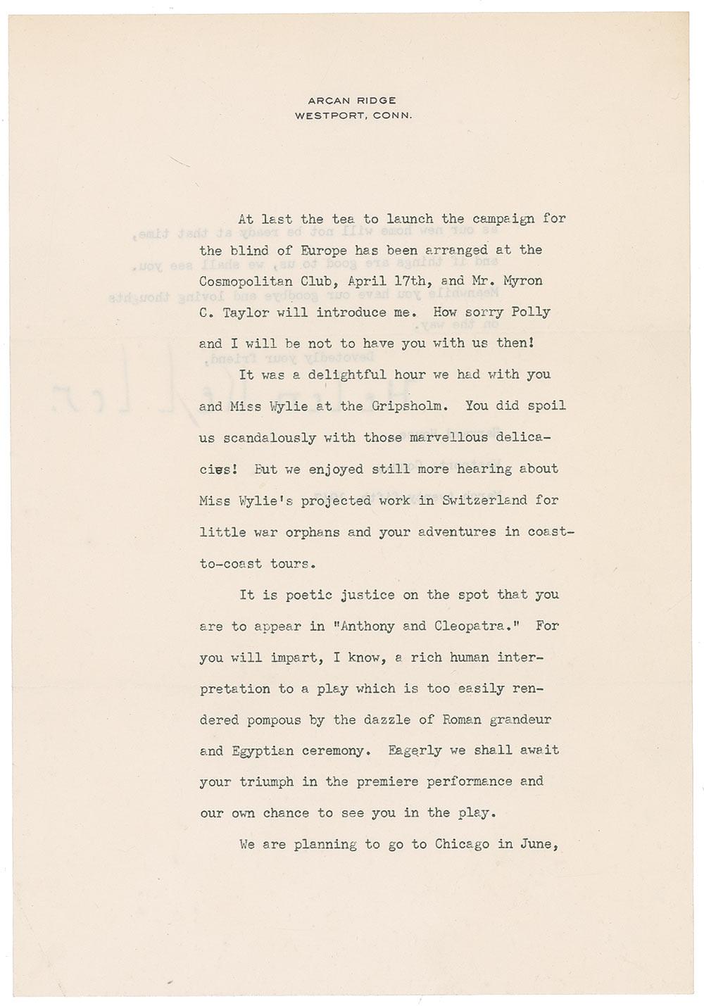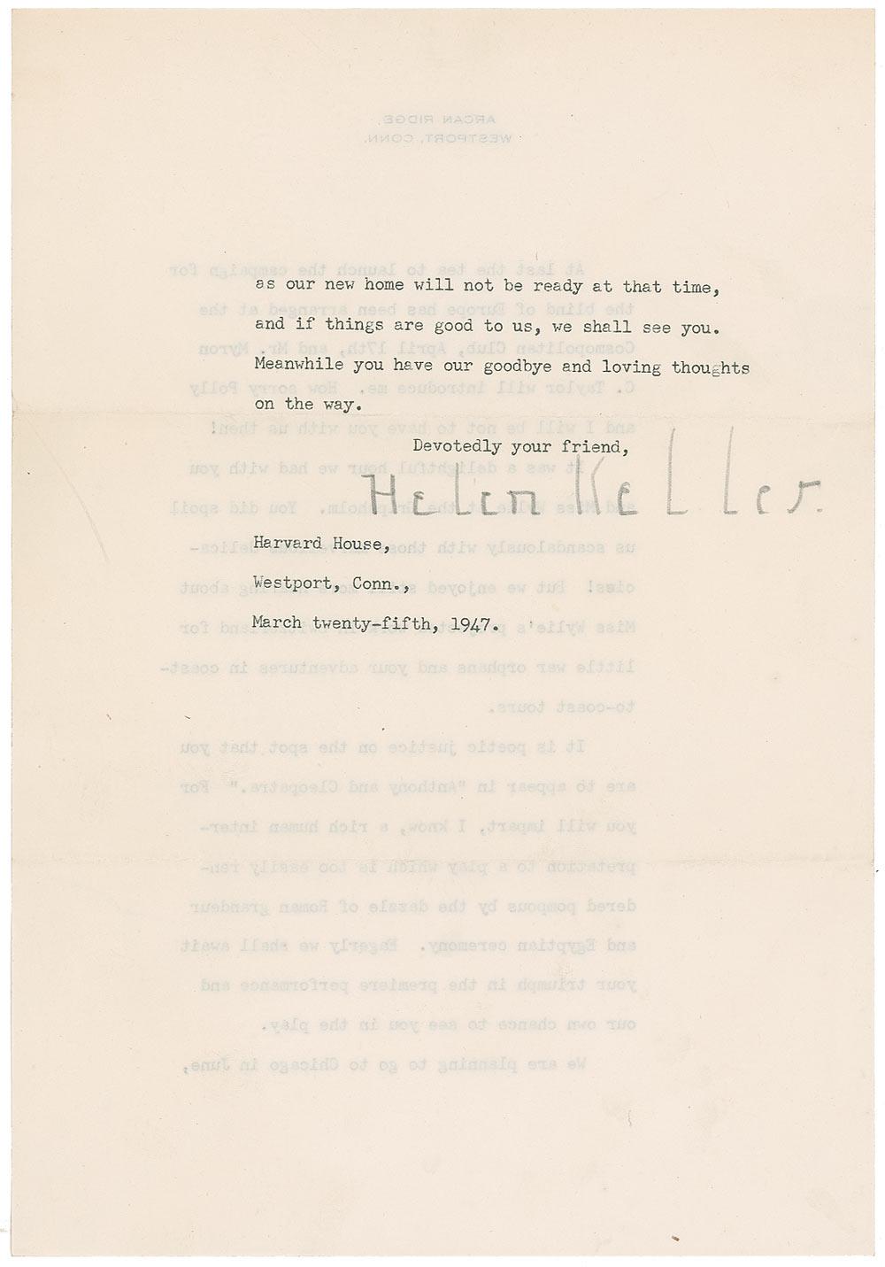 TLS, three pages on two adjoining sheets, 7.25 x 10.5, Arcan Ridge letterhead, no date. Keller writes “Dearest Katharine” (stage actress Katharine Cornell) in care of Harvard House in Westport, Connecticut. In part: “The glow of Polly’s and my several visits with you since Christmas-time has warmed us through a tiresomely cold winter. Gratefully I remember meeting you on the train years ago and how our hearts flew open to you. Of course we had known of your ennobling work in the drama as a way to foster idealism in the people, and we had admired you with an almost reverential affection, and O, what a happiness it was when your sweet human love encircled us! That made you a real person, and while it does not dim to us your achievements, it is as dearest Katharine that we feel most close to you. Yet it is because you are such a beautiful inspirer of your fellowmen that you are so precious…At last the tea to launch the campaign for the blind of Europe has been arranged at the Cosmopolitan Club...How sorry Polly and I will be not to have you with us then!...It is poetic justice on the spot that you are to appear in ‘Anthony and Cleopatra.’ For you will impart…a rich human interpretation to a play which is too easily rendered pompous by the dazzle of Roman grandeur and Egyptian ceremony.” In fine condition. Accompanied by a full letter of authenticity from PSA/DNA. Robust accolades from Keller to the actress!