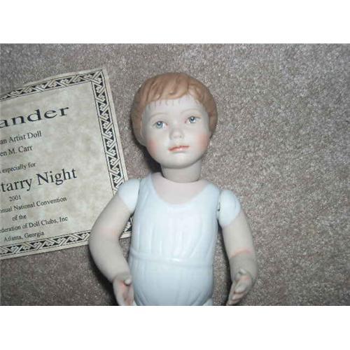 Here is a doll from the United Federation of Doll Clubs, Inc. National convention held 2001 in Atlanta, GA. The doll was made by artist Helen M. Carr. The doll is 7 1/2" and is called Alexander. He comes with his paper saying he was created especially for Starry Starry Night 2001 UFDC Convention. He is a jointed doll so has head, arms and legs strung on. He is marked on the head UFDC 2001 Helen M. Carr. He will come packed in the brown box he was presented to attendees in.