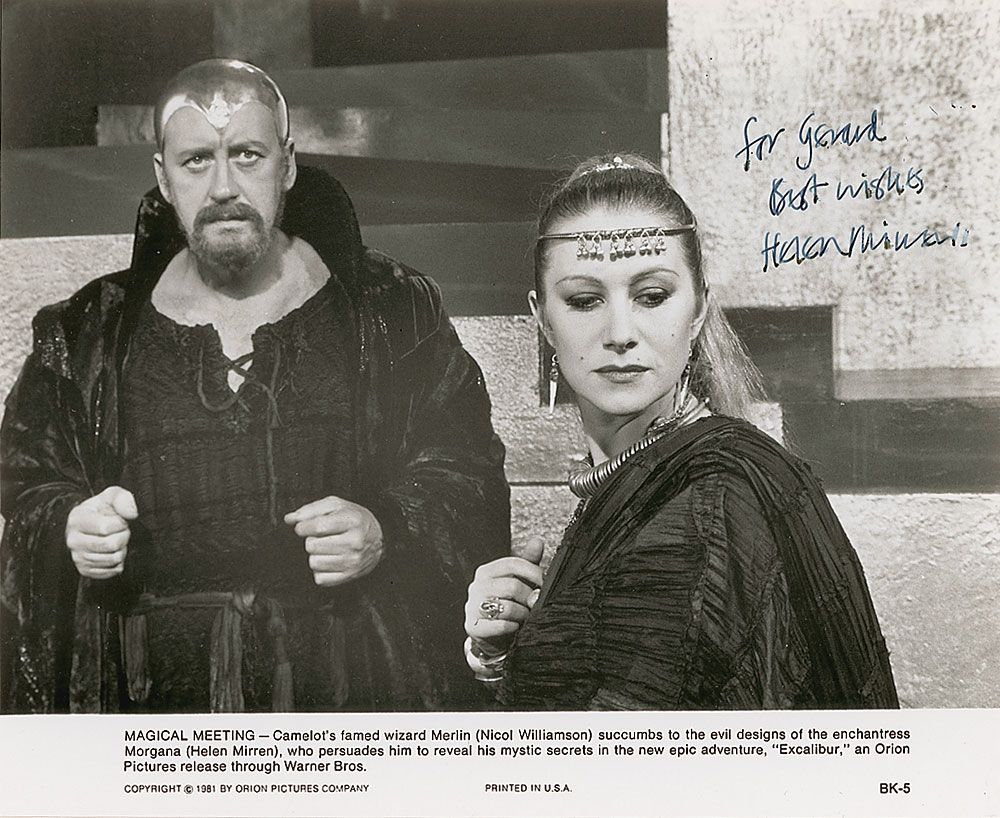 Glossy 9.25 x 7.5 promotional photo for the 1981 film Excalibur, signed and inscribed in black ink, “For Gerard, Best wishes, Helen Mirren.” In fine condition.