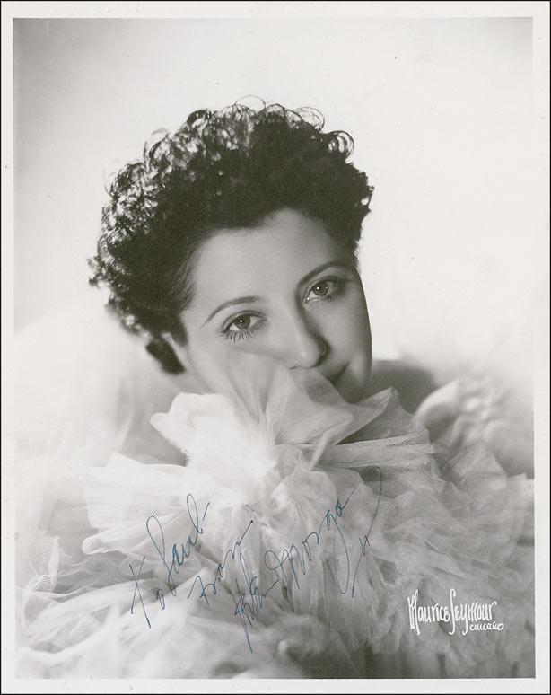 Vintage matte-finish 8 x 10 Maurice Seymour photo of Morgan wrapped in chiffon, signed and inscribed in-person in blue ink “To Saul—from Helen Morgan.” Reverse of photo bears collector’s stamp date of October 14, 1937, the date the signature was acquired. In fine condition, with some light surface marks to top, and a bit of light foxing to edges. Saul Goodman Collection.