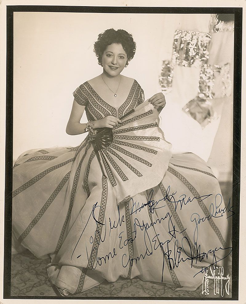 Vintage glossy 8 x 10 double-weight photo of Morgan in a flowing gown holding a matching fan, signed and inscribed in fountain pen, “To Dick Mongende—Come East young man, Come East—Good luck, Helen Morgan.” A tack hole to top edge and scattered creases, heavier to right side, otherwise fine condition.