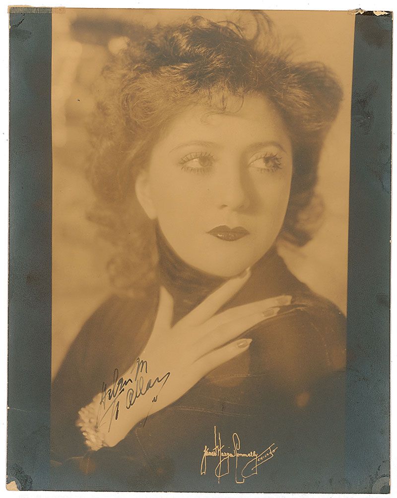 Vintage matte-finish 7.5 x 9.5 photo of Morgan with her hand to her chest, signed and inscribed in fountain pen, “Helen M, To Allan.” In very good condition, with a crease to the left edge, small areas of mounting remnants and surface loss to corners, and light silvering to borders.