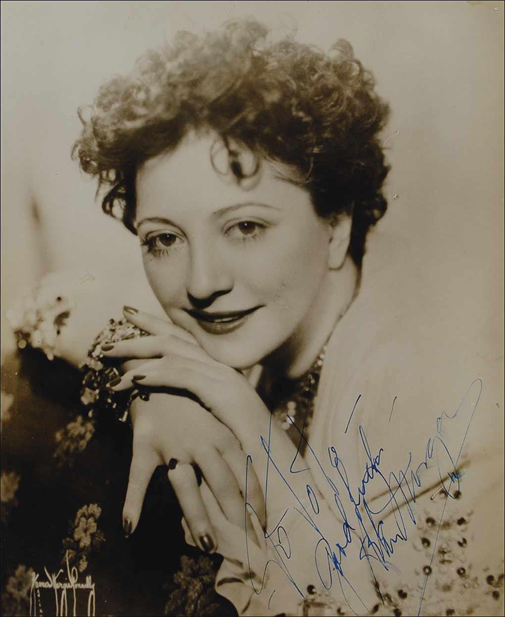 Vintage glossy 8 x 10 photo of Morgan resting her chin on her hands, signed and inscribed in fountain pen “To Toto—Good luck, Helen Morgan.” Matted to an overall size of 12.5 x 14.5. In very good condition, with several brushes to signature, and scattered light surface marks and impressions.