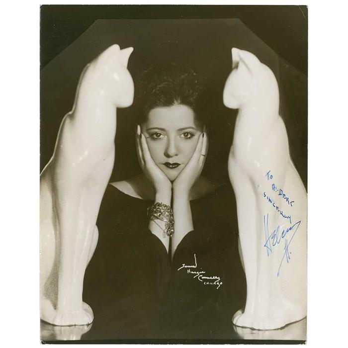 Quintessential torch singer and actress, she died of cirrhosis of the liver at age 41. Elegant vintage glossy 7.5 x 9.5 portrait of Morgan, hands on cheeks, porcelain cats at her sides, signed and inscribed in blue fountain pen, “To Albert, sincerely, Helen.” Light paperclip impression to top edge, small crease to top right corner tip, and faint silvering to darker areas, otherwise condition is fine. Pre-certified PSA/DNA and RRAuction COA.