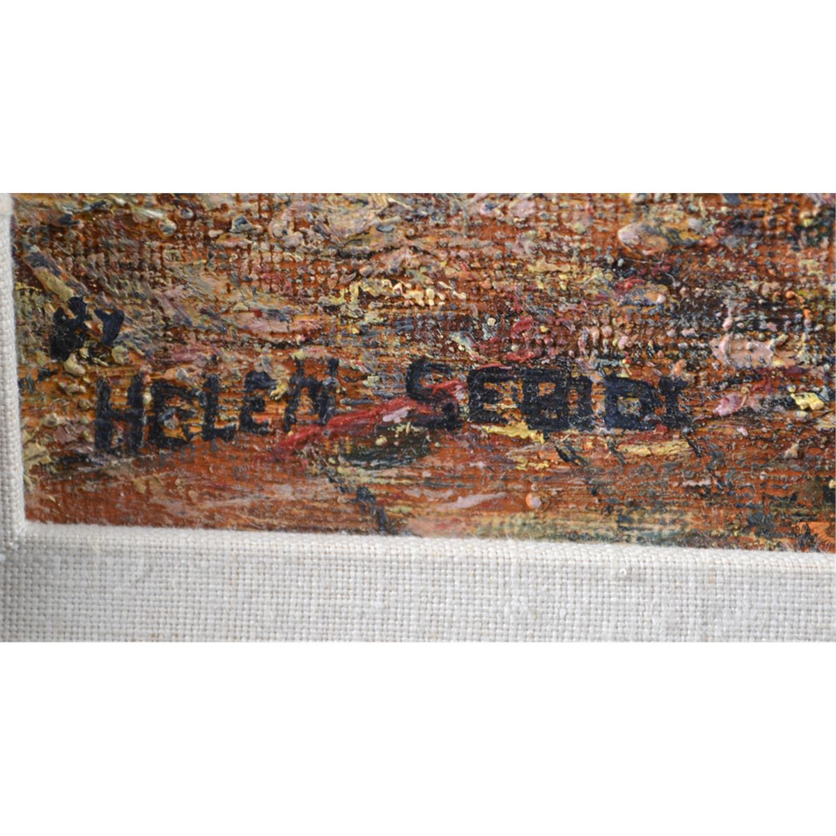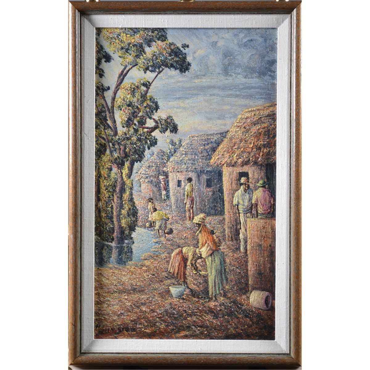 Depicting figures in everyday life with trees and huts, signed lower left and appears to be dated 67 or 84 with additional 84 written en verso. Helen Sebidi (Mmargabo Mapula) born 1943 African known for her paintings and sculptures, 19.75" H x 11.5" W sight, 23" H x 14.75" W framed. Private collection Lake Orion, MI