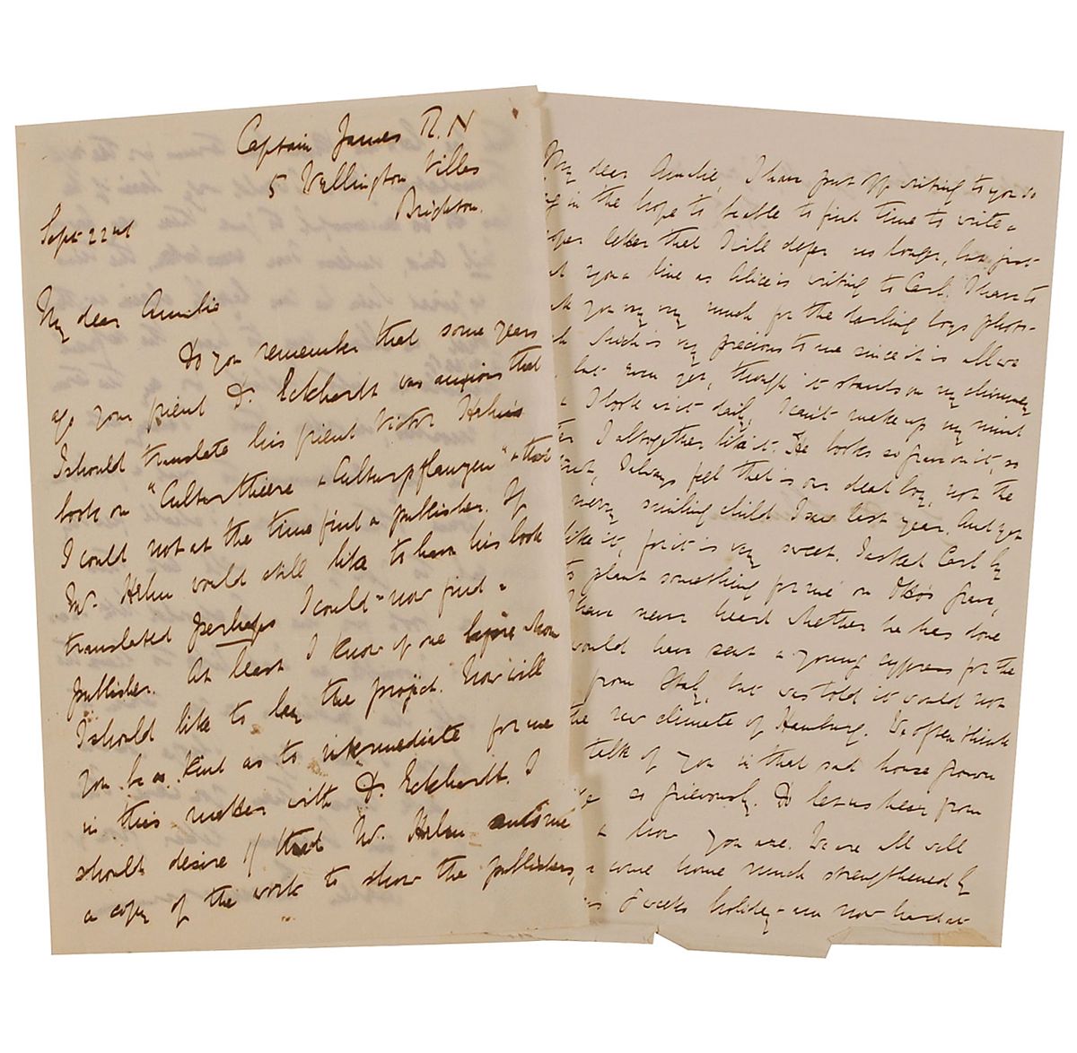 German-British writer and translator (1846–1934), best known for translating Nietzsche. Two letters: one ALS signed H. Z.,” one page both sides, 5.25 x 8.25, no date; and one ALS signed “Helen Zimmern,” two pages on two adjoining onionskin sheets, 5.25 x 8.25, September 22, [no year]. Both addressed to “Amelie.” First letter, in part: “Thank you very very much for the darling boys photograph which is very precious to me since it is all we have. He looks so grave in it…I asked Carl by Alice to plant something for me on Otto’s grave.” The second, in part: “If Mr. [Victor] Hehn would still like to have his book translated perhaps I could now find a publisher.” A few slight edge chips and tears, otherwise fine condition.