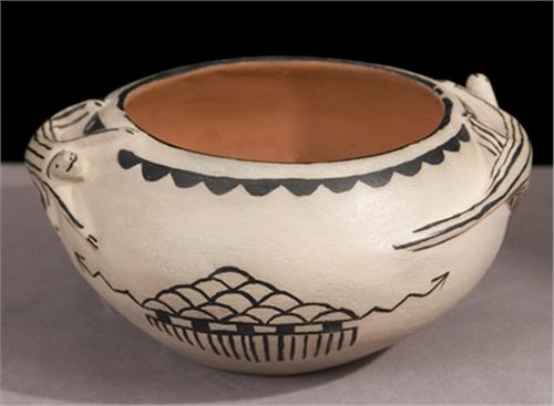 Helen (b. 1915) and George Cordero. Fetish Pot. 4 1/2" x 9 1/2". Black designs on white slip. Fine condition. (est $1,000-1,500)