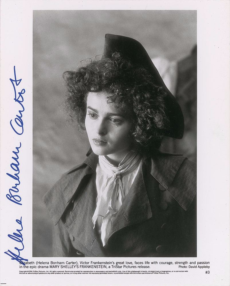 Glossy 8 x 10 Tri-Star Pictures publicity photo of Bonham Carter as Elizabeth from the 1994 film Mary Shelley's Frankenstein, vertically signed in blue felt tip. In very fine condition. From the Harvey and Rhoda Kuflik Collection.