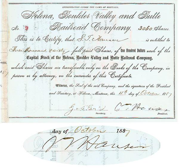 1887, Montana. Stock certificate for 3060 shares. Issued to and signed on verso and as president by Samuel T. Hauser (1833 1914). Pioneer miner, capitalist and territorial governor of Montana. Star punch cancellation slightly affects Hauser's signature as president only. Very fine.