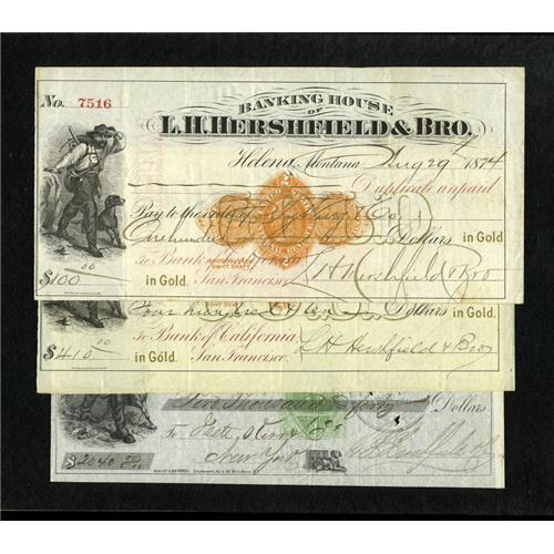 <B>Helena, MT- L.H. Hershefield & Bro.</B></I> Three checks payable in Gold. Two of the checks are similar in design and are both dated 1874. They feature a miner vignette at left and a gold overprint of the word GOLD. Two Cent revenue stamps are also noted. The other issue is a similar issue dated 1866, but features an older design with a green revenue stamp. <B>Fine</B></I> or better with an occasional split in the paper.<BR><BR><b>Shipping:</b> Coins & Currency (<a target="_blank" href="http://www.heritageauctions.com/common/shipping.php">view shipping information</a>)