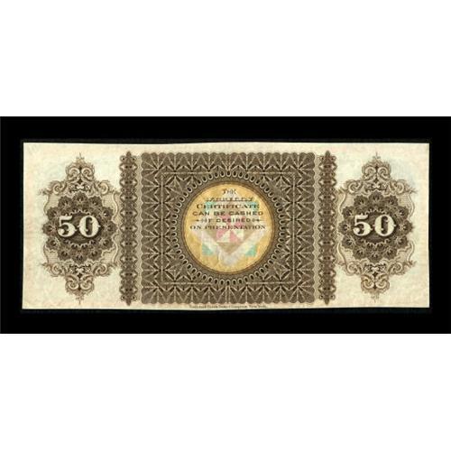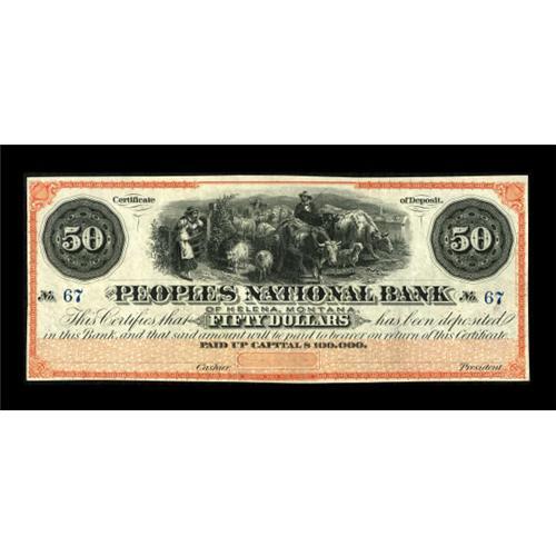 <B>Helena, MT- Peoples National Bank </B></I>$50 Undated<BR> This bank was open from 1873 to 1878. There are no known national bank notes and the Peoples only had $335 outstanding as of 1915. Certificate of deposit remainders are the only way to collect this Lewis and Clark County bank. This CD remainder also has pre-printing paper crinkles and serial number 67 making it the perfect mate for the note in the previous lot. <B>Crisp Uncirculated.</B></I><BR><BR><b>Shipping:</b> Coins & Currency (<a target="_blank" href="http://www.heritageauctions.com/common/shipping.php">view shipping information</a>)