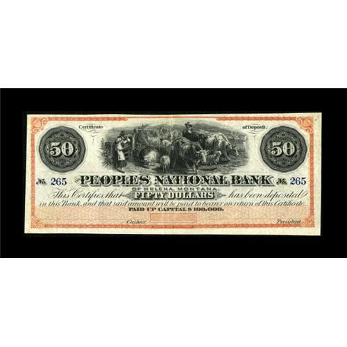 <B>Helena, MT- Peoples National Bank</B></I> $50 Undated<BR> This <B>Very Fine-Extremely Fine </B></I>$50 CD is a remainder and there is some adhesive on the back. <BR><BR><b>Shipping:</b> Coins & Currency (<a target="_blank" href="http://www.heritageauctions.com/common/shipping.php">view shipping information</a>)