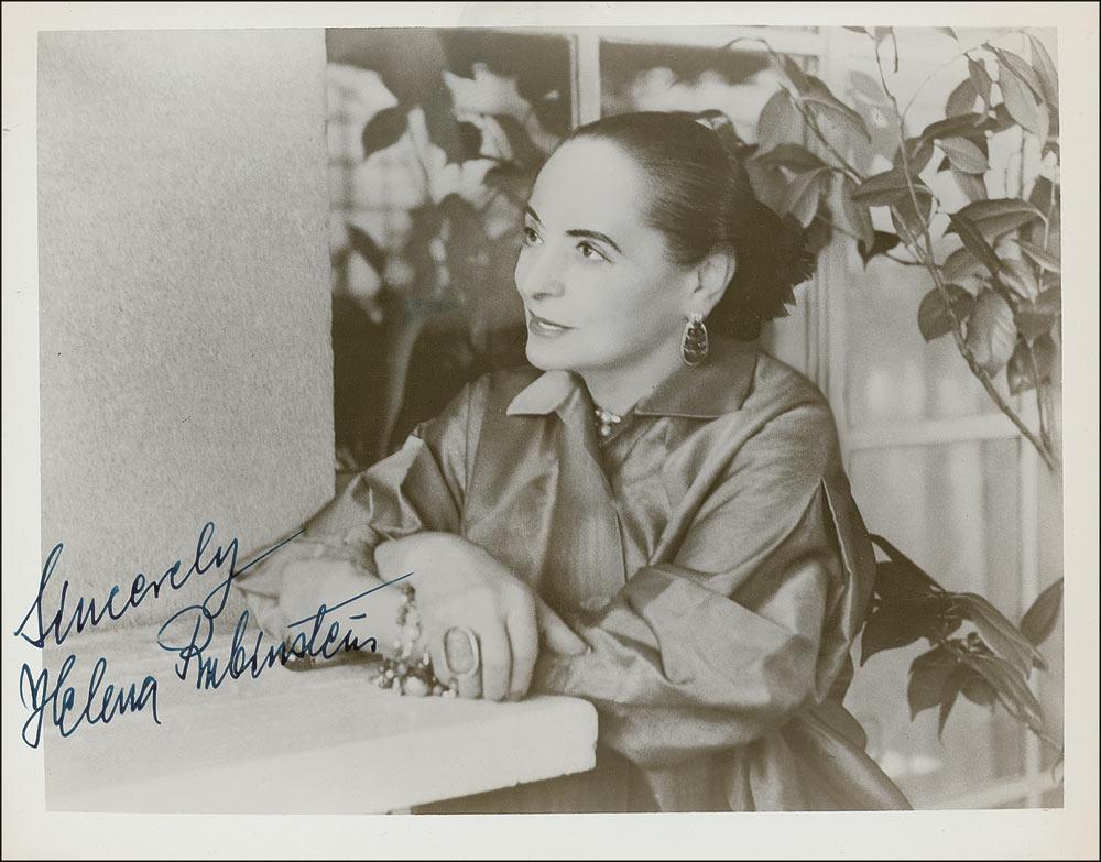 Polish-born businesswoman (1871–1965) who launched a multimillion-dollar cosmetics empire. Vintage glossy 10 x 8 photo, signed in fountain pen. In fine condition, with a few light creases and surface marks, and binder dings to lower edge.