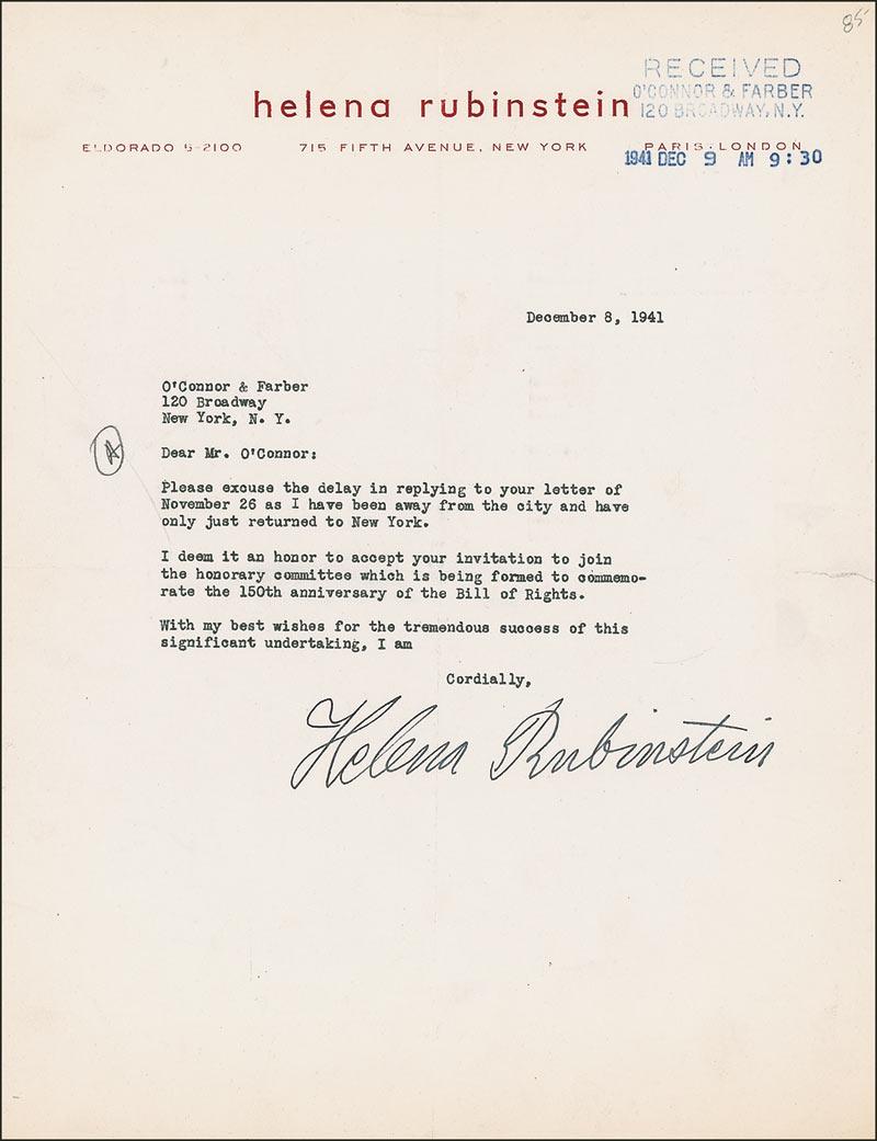 Polish-born businesswoman (1871–1965) who launched a multimillion-dollar cosmetics empire. TLS, one page, 8.5 x 11, personal letterhead, September 8, 1941. Rubinstein accepts a committee invitation. In part: “I deem it an honor to accept your invitation to join the honorary committee which is being formed to commemorate the 150th anniversary of the Bill of Rights.” Central horizontal and vertical fold, one through a single letter of signature, office stamp and notation to front, and a small tape repair to fold separation on reverse, otherwise fine condition. Pre-certified PSA/DNA and RRAuction COA.