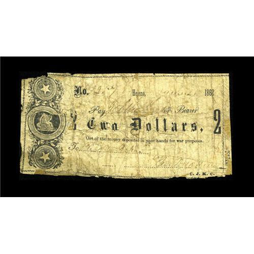 <B>Helena, TX- Karnes County</B></I> $2 1862 Medlar 2<BR>The initials "C.J.K.C" in the lower right corner stands for "County Judge Karnes County." This note is missing more than is readily apparent along the right side where the redeemable clause has been lost. <B>Fair,</B></I> backed.<BR><I>From The William A. "Bill" Bond Collection</B></I><BR><BR><b>Shipping:</b> Coin/Currency (<a target="_blank" href="http://www.heritageauctions.com/common/shipping.php">view shipping information</a>)