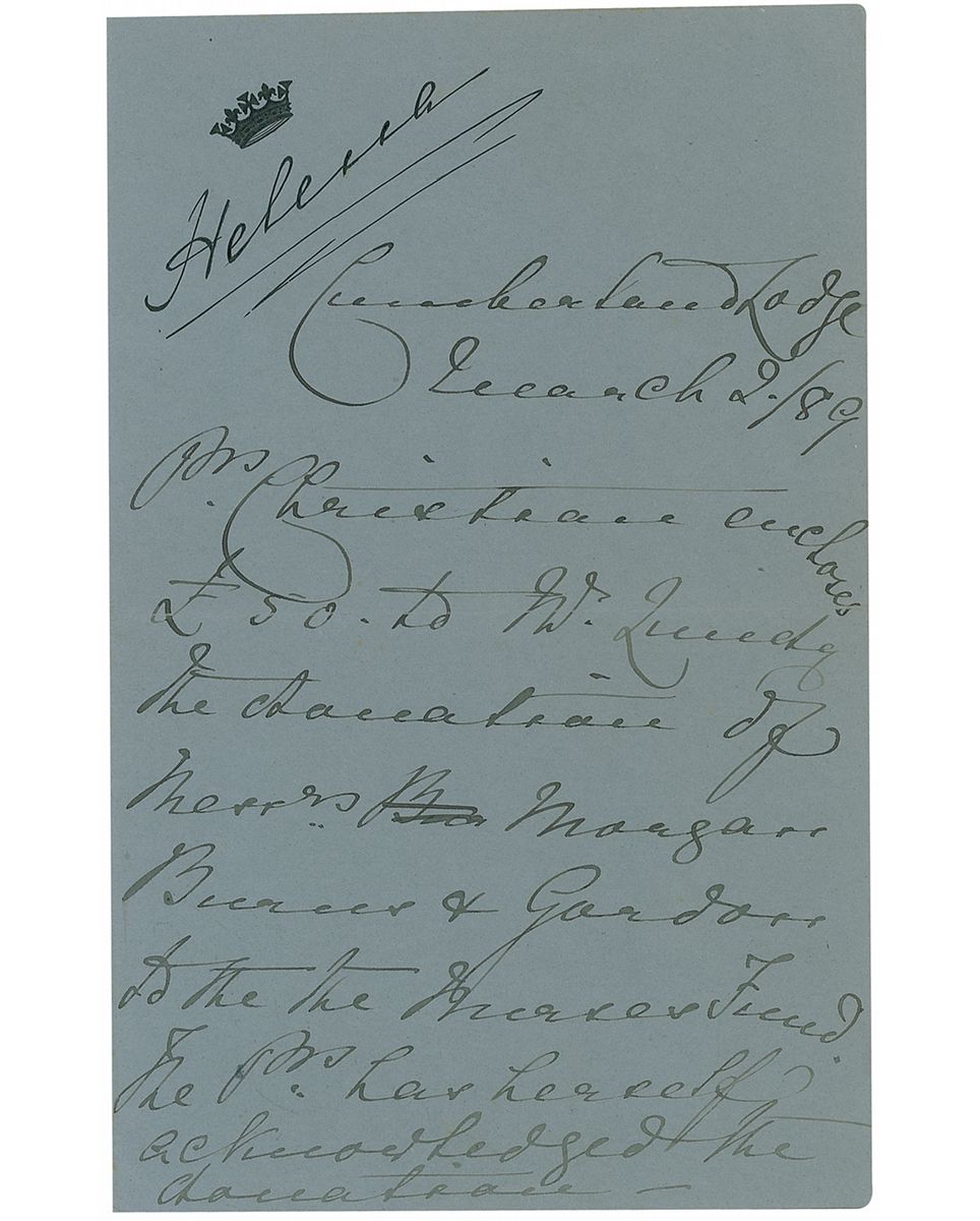 Fifth child of Queen Victoria and Prince Albert, and one of the founding members of the Red Cross (1846–1923). Unsigned autograph letter, one page, 4.5 x 7, personal letterhead, March 2, 1889. Letter to a gentleman regarding a payment. In fine condition. Accompanied by an unsigned original carte-de-visite portrait of Helena.