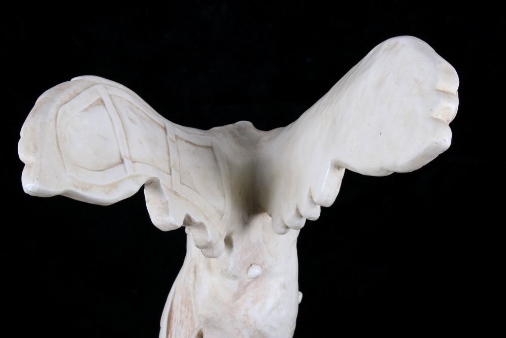 For your bidding pleasure is this Helenistic Nike of Samothrace by A.M.R. Studios. This sculpture is of an angel in classic Helenistic style, and is a replica of a celebrated statue created at around 2nd century BC. The image is of an angle poised to flight classically missing its head and arms but displaying powerful wings. The inscription at the bottom of the sculpture is 09155 and A.M.R. The measurements of the sculpture are 22 1/2" x 10 1/2" x 12"
