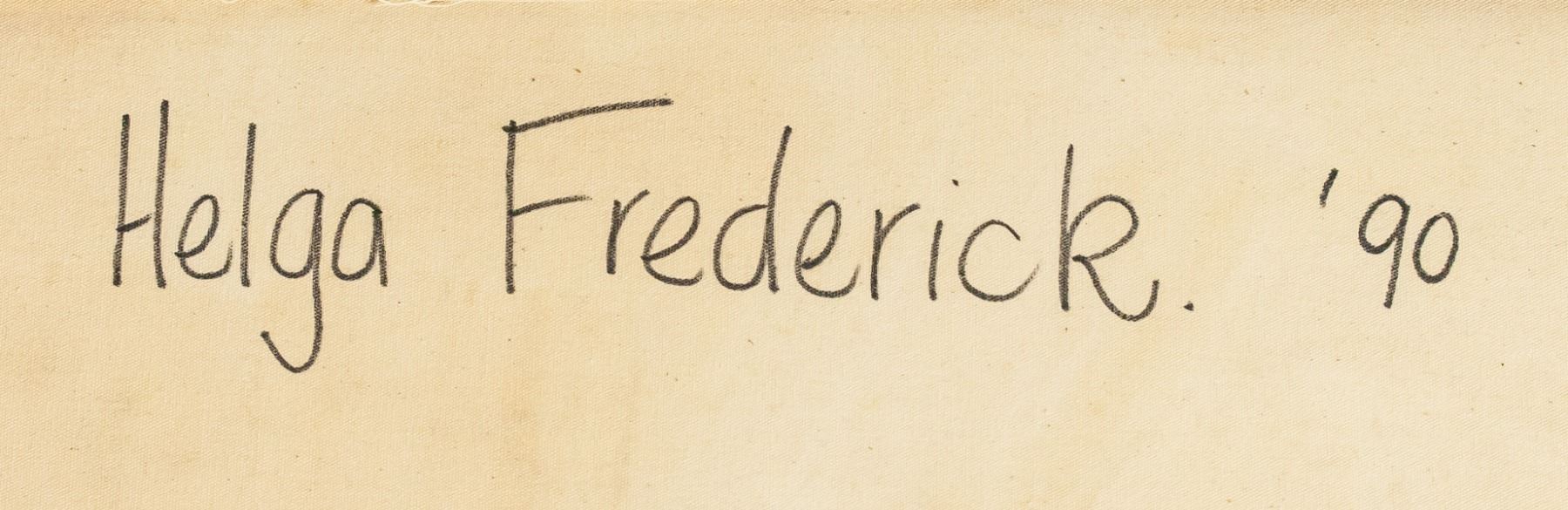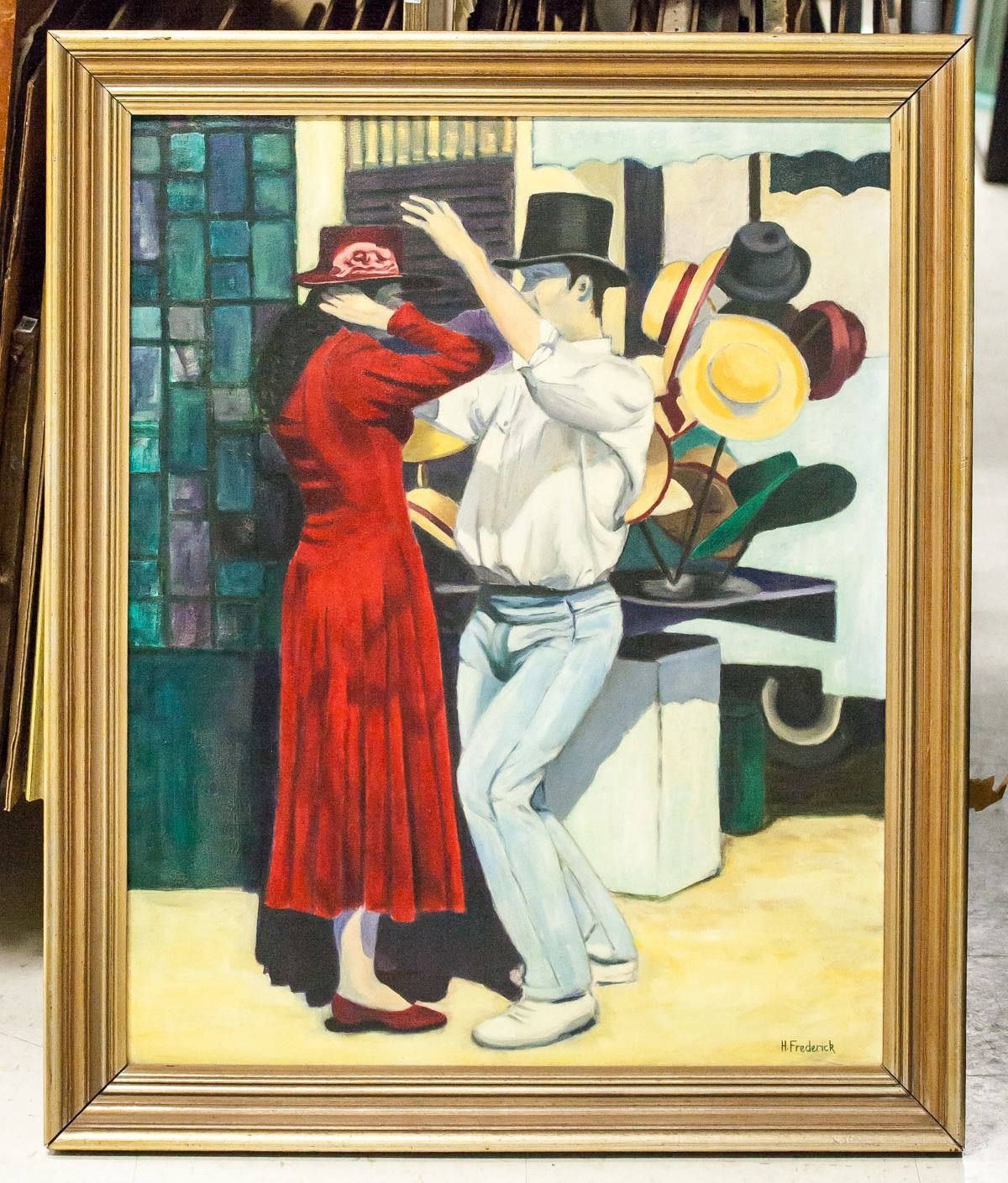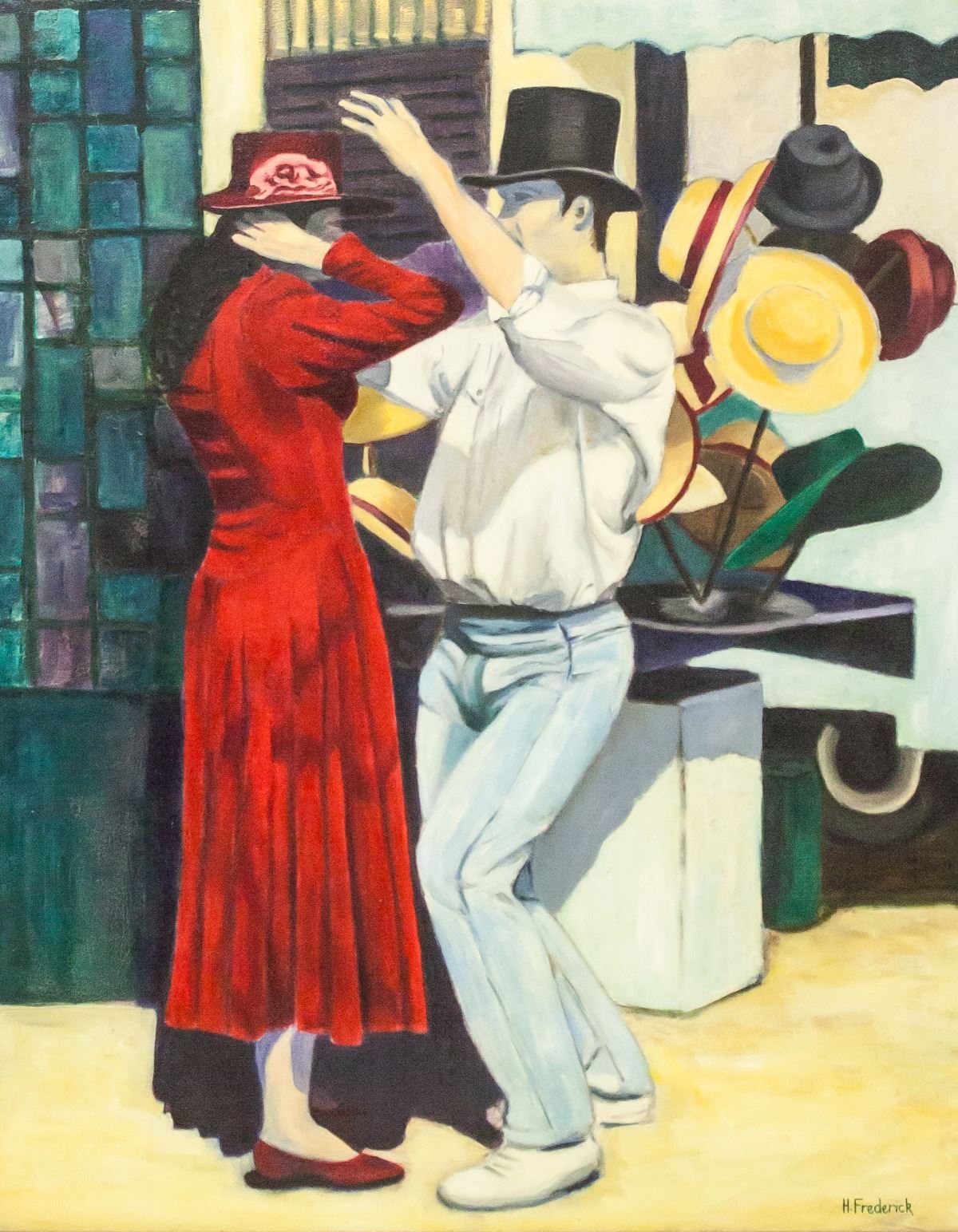 Oil on canvas, framed. Featuring a woman in a red dress and a man in a white shirt and light blue pants dancing. Signed "H. Frederick" in the bottom right corner. "Helga Frederick '90" inscribed on verso. 74 x 59 cm (29 x 23 in), Frame: 87.5 x 72 cm (34.5 x 28.5 in).