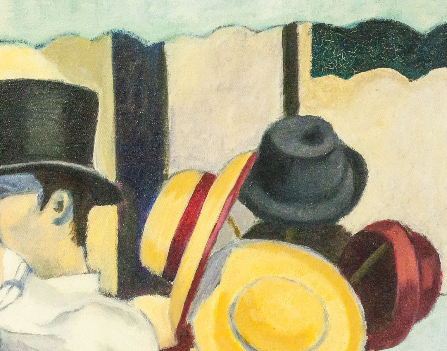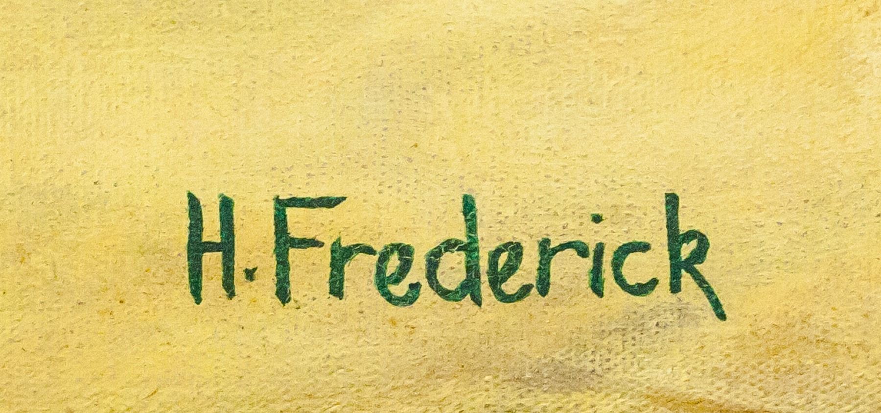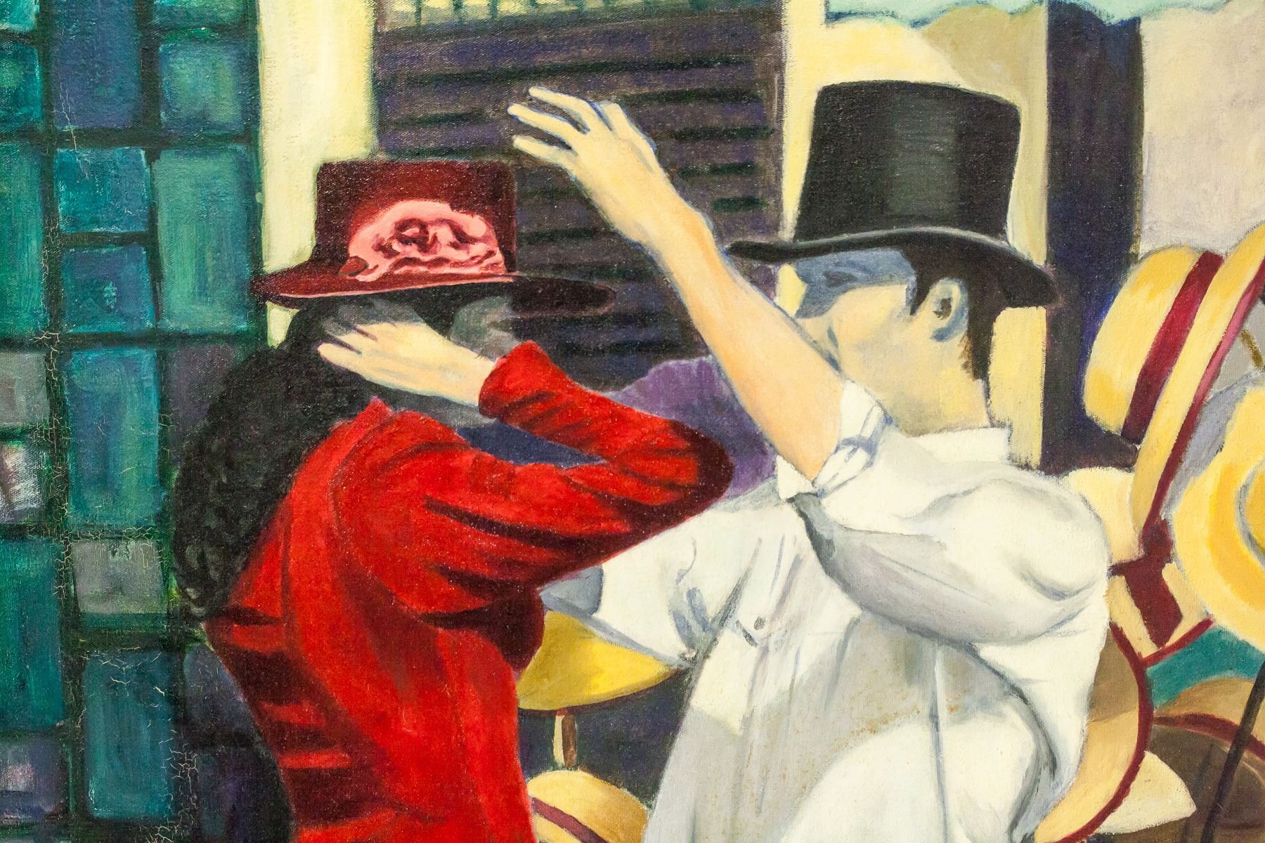 Oil on canvas, framed. Featuring a woman in a red dress and a man in a white shirt and light blue pants dancing. Signed "H. Frederick" in the bottom right corner. "Helga Frederick '90" inscribed on verso. 74 x 59 cm (29 x 23 in), Frame: 87.5 x 72 cm (34.5 x 28.5 in).