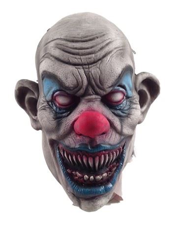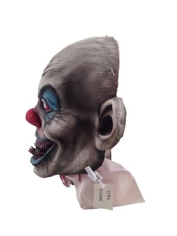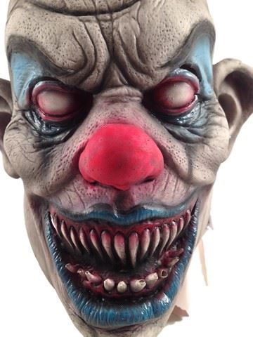 Screen worn Clown mask . This is a sfx latex clown mask with grey, blue and red coloring. The lower teeth protrude and are broken off slightly at the apex. Velcro strap that goes around the back of the head to keep it in place. In this film, a masked serial killer turns a horror-themed amusement park into his own personal playground, terrorizing a group of friends while the rest of the patrons believe that it is all part of the show. (15x8)