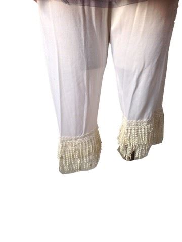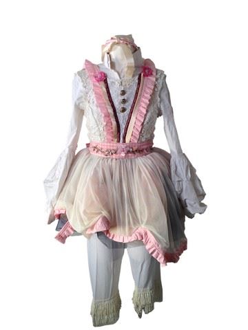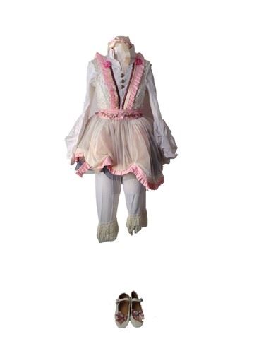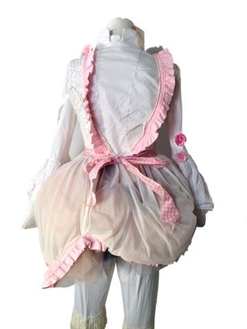 Baby Doll screen worn costume - white button up shirt with pink flowers and large puffy arms, white baby doll underpants with ruffles at the bottom of the legs, apron like dress that goes over the top of the pants and shirt. Apron is a pink checkered pattern with a large lacy skirt bottom, white embroidered top half with gold buttons and ties in the back. Also includes white leather "Urban Outfitters" shoes with a pink silk bow on the top and a rhinestone gem for decoration(8), pink satin headband with cream colored bow. This outfit is worn in scene 27.