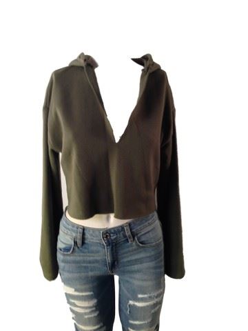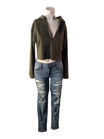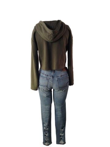 Brooke (Reign Edwards) screen worn, hero, green "Top Shop" hooded crop sweatshirt with low cut v-neck, light wash denim "American Eagle" jeans with multiple vertical slashes down front of the legs. Worn in the opening scenes when Natalie (Amy Forsyth) arrives at her house.