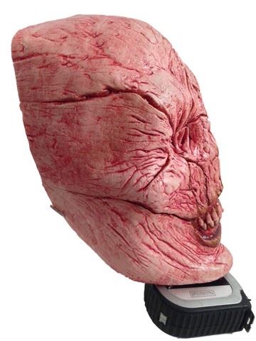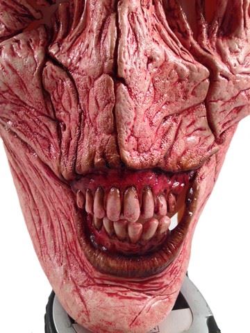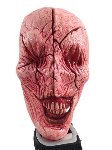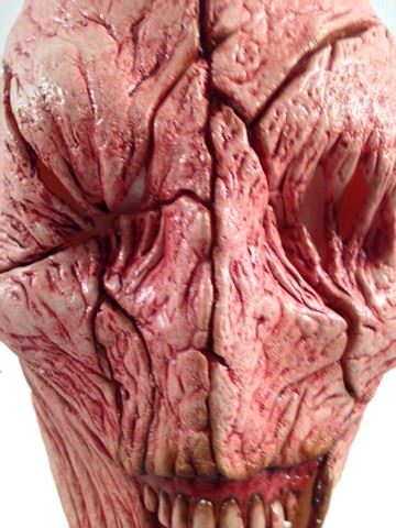 C.V. Mask screen worn, sfx, latex mask. The mask is red and brown, and looks as though the skin has been removed to expose only the muscle and tissue. Has detailed teeth and a protruding chin.(12x7)