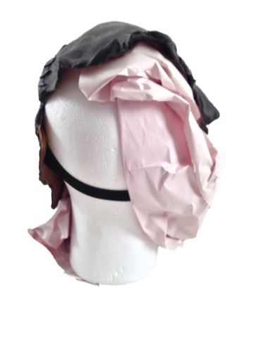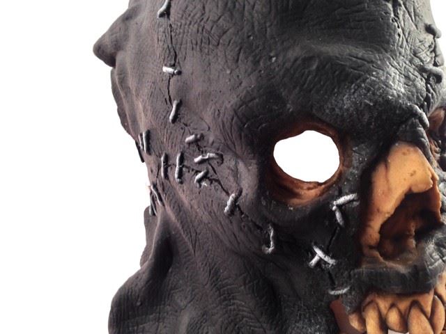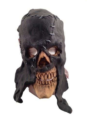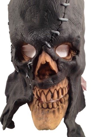 C.V. Mask screen worn, sfx latex mask - mask is grey, beige and black and looks like a black burlap sac that has been stapled together with a skull underneath. Has protruding chin and teeth andvelcro strap goes around the back of the head.(12x7)