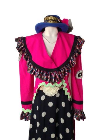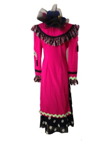 Female Clown, screen worn, bright pink jacket that is midriff baring in the front and long in the back, the jacket also has a ruffle around the neck that in polka dots with multi colors and a design on the sleeves, polka dot black and white long satin skirt, royal blue hat with black lace and pink fuzzy ball, crouched belt with flower.
