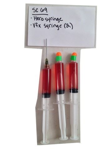 Screen used, hero, syringes, filled with blood.1 Hero syringe, 2 special effects (sfx) syringes. (8x1) Used in scene 69.
