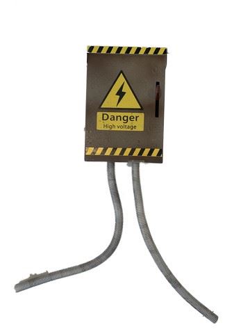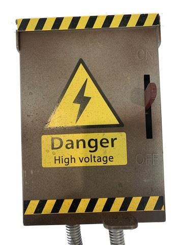 Screen used "Danger High Voltage" wall decor prop. Currently functions with lights and sounds as if you're being electrocuted (box measures 10"x7")