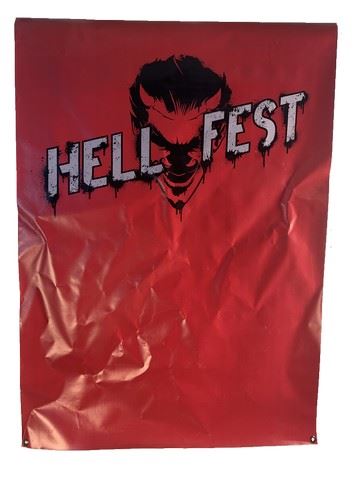 Hell Fest vertical, red banner with logo (rolled) (approx. 3' W x 6' L).