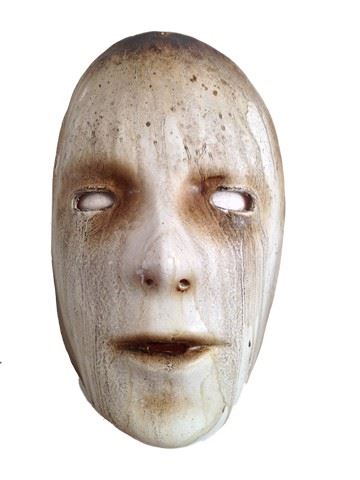 Screen worn Robed Mask Scarer sfx mask. Cream and black in color. The mask looks as if the makeup is running down the face.(8x6)