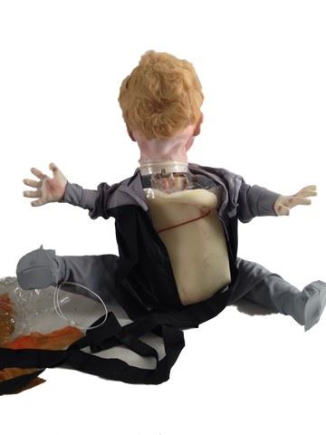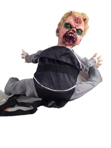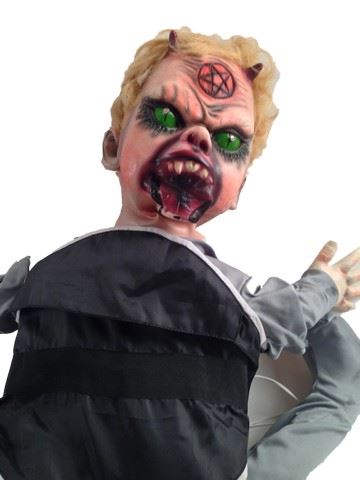 Screen used, battery operated devil baby in baby carrier - baby's head spins around and his eyes light up. Baby has tattoo of the devil sign on his forehead with evil green eyes, sharp protruding teeth and horns on his head.(23x23)