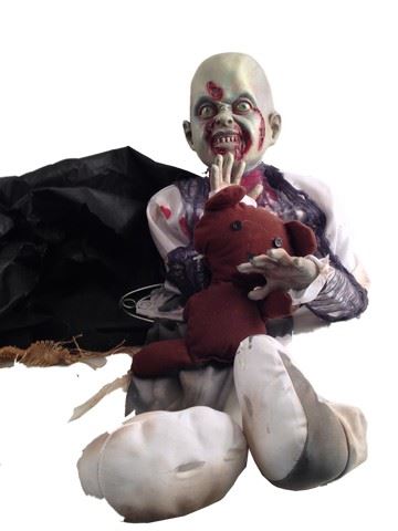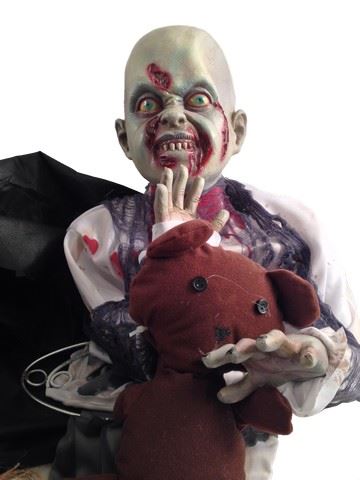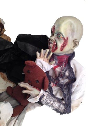 Screen used, hanging vampire zombie baby - Has head wounds and half of the head is bashed in. Baby can hang or sit and holds a teddy bear.(24x12)