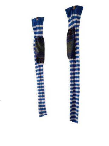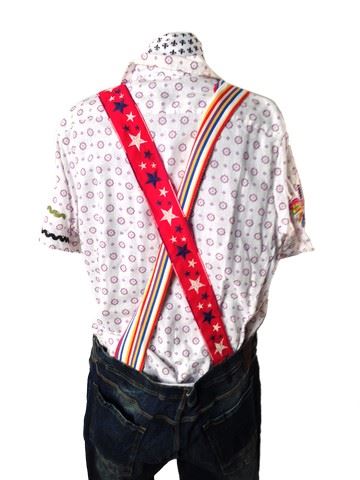 Sparky mutant clown screen worn, white and purple floral shirt with designs on shoulders of the shirt, very colorful bow tie with lots of ribbons, grey undershirt, huge loose fitting jeans with buttons attached and suspenders, arm socks blue and white stripes with patches on elbows.