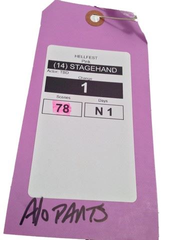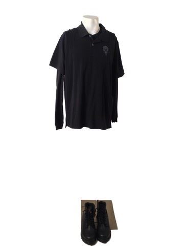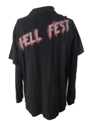 Stage Hand screen worn, black polo with "Hell Fest" on the back, black "Levi" under shirt, low ankle black work boots, wardrobe tag included. Worn in scene 78.